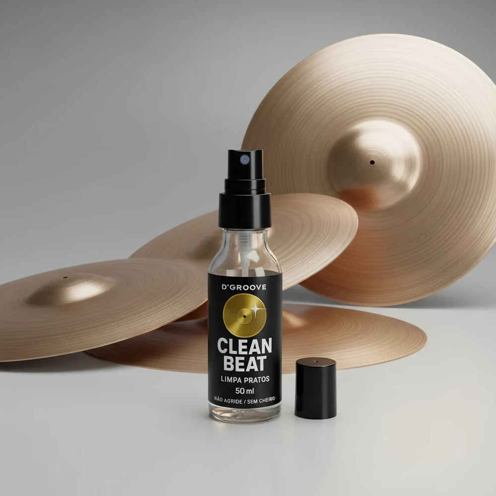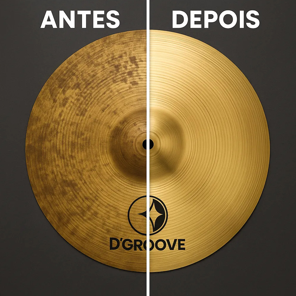 🧴 D’Groove Clean Beat remove oxidação, marcas e sujeira de pratos e ferragens de bateria sem agredir o metal. Fórmula neutra, biodegradável e de ação rápida que devolve o brilho e protege o acabamento.